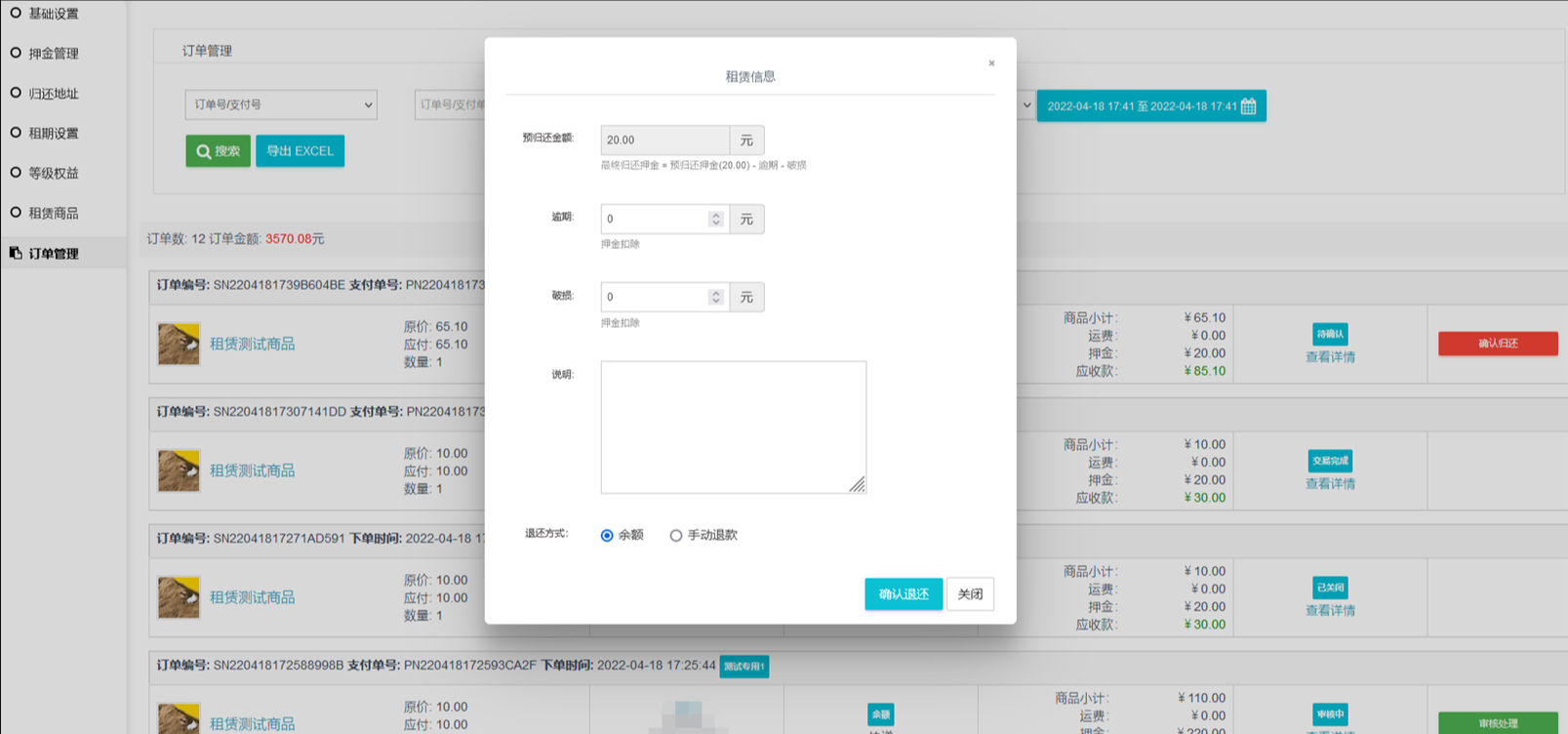 退还流程:用户订单中申请退还--后台审核退还申请--用户退还商品、填写退还物流信息--后台确认退还,填写逾期、破损扣除金额及说明,设置退还方式(支持退还到余额、手动退还)--确认退还--押金按照选择的退还方式退还。