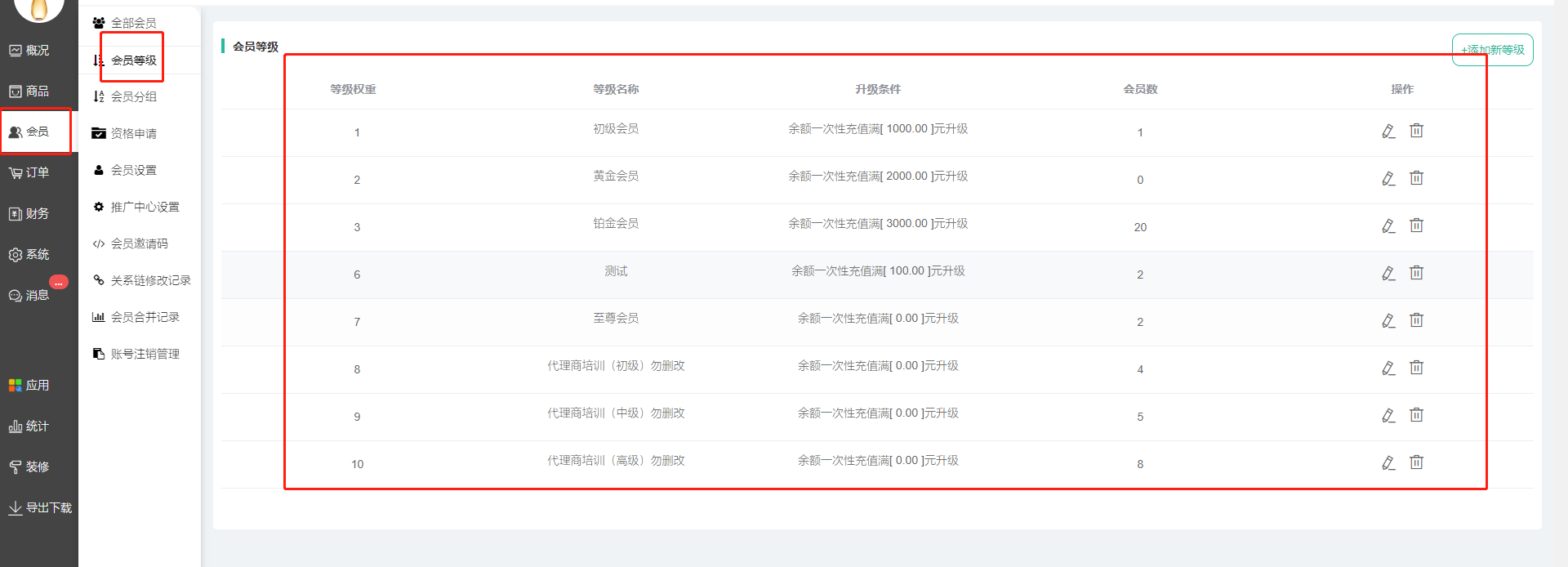 1.会员设置的升级条件需要设置成为一次性充值余额